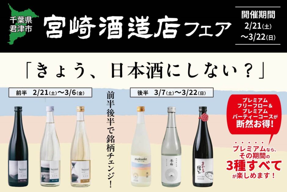 ここで、日本酒通をうならせる「宮崎酒造店」(千葉県君津市)の数種の日本酒をいただけるフェアが開催される。