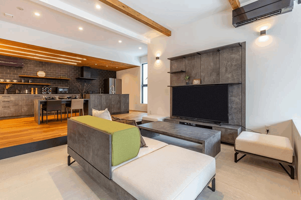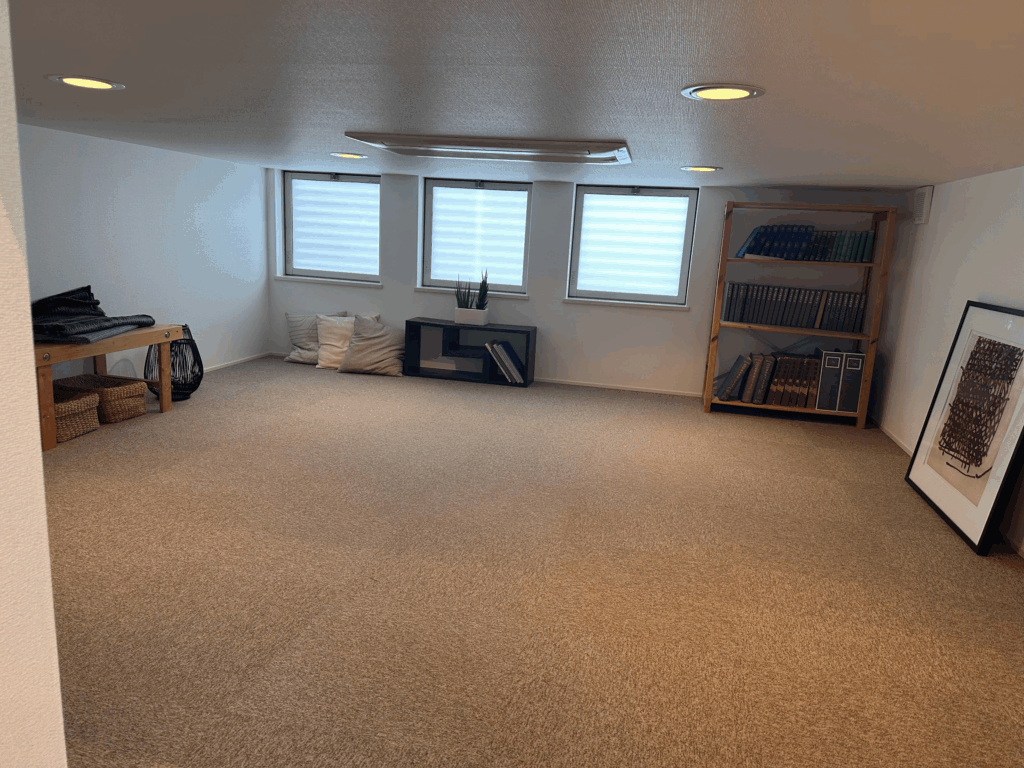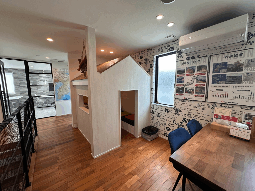 続いて立ち寄ったのは「Maruko-Home」。こちらのモデルハウスの最大の特徴は、なんといってもリビングがほぼ“土間”で構成されている点。一般的な住宅と違い、靴を脱がずにそのままリビングへ入れる構造になっており、来客時やアウトドア用品の管理にも便利なアイデアです。