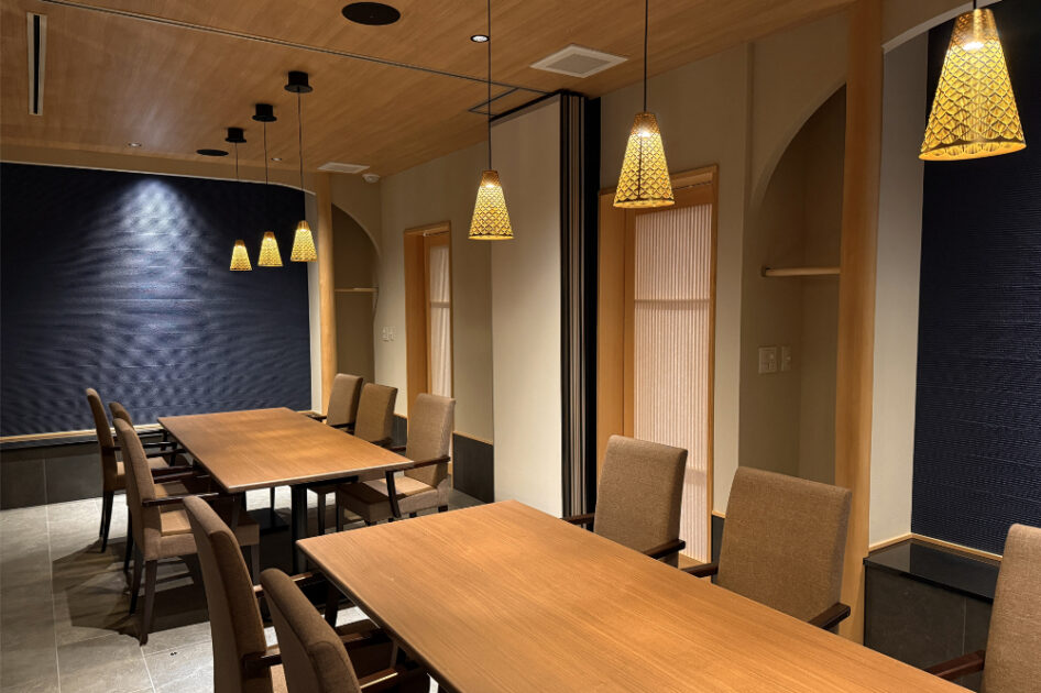 用途に応える多様な空間:店内は全80席を備え、大小個室を完備。ご家族の集まりや、特別な日の食事など、さまざまな用途で利用できる快適な空間となっている。