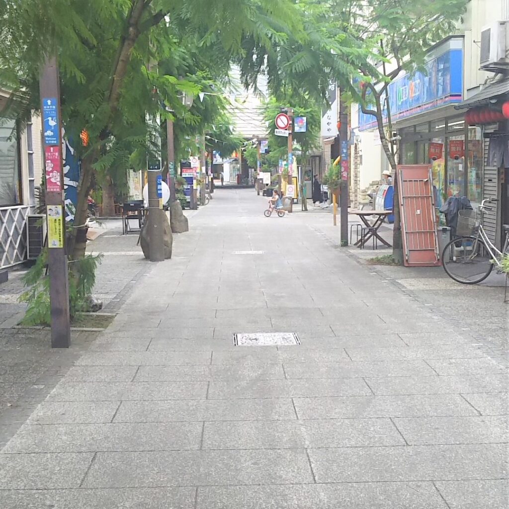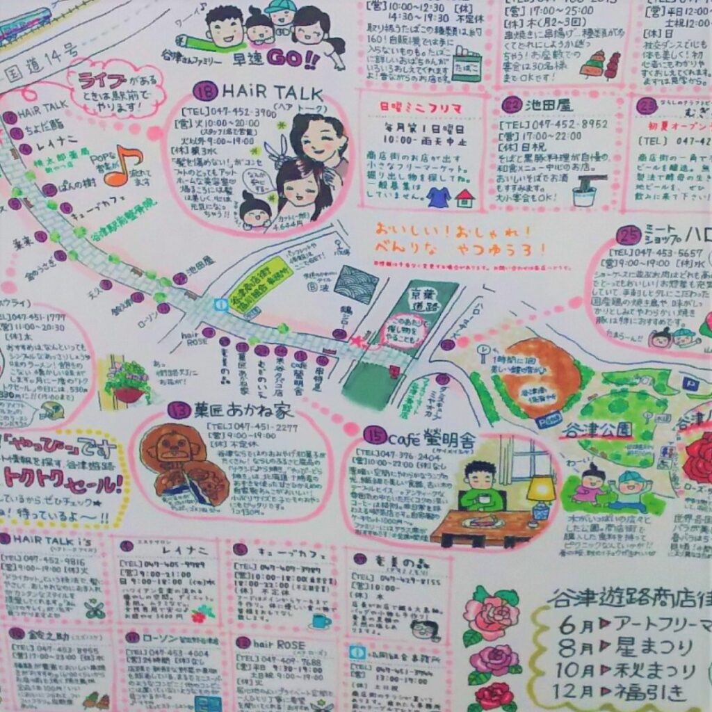 谷津駅の南口から歩くとすぐに、干潟に直結する商店街があります。コンビニ・喫茶店・大衆食堂などが多く立ち並んでおり、どこか昭和レトロの雰囲気が香る商店街です。街路灯には、写真右のお手製マップが取り付けられていますので、どんな店があるのか一目で分かります。お気に入りのお店が見つかるかもしれません。