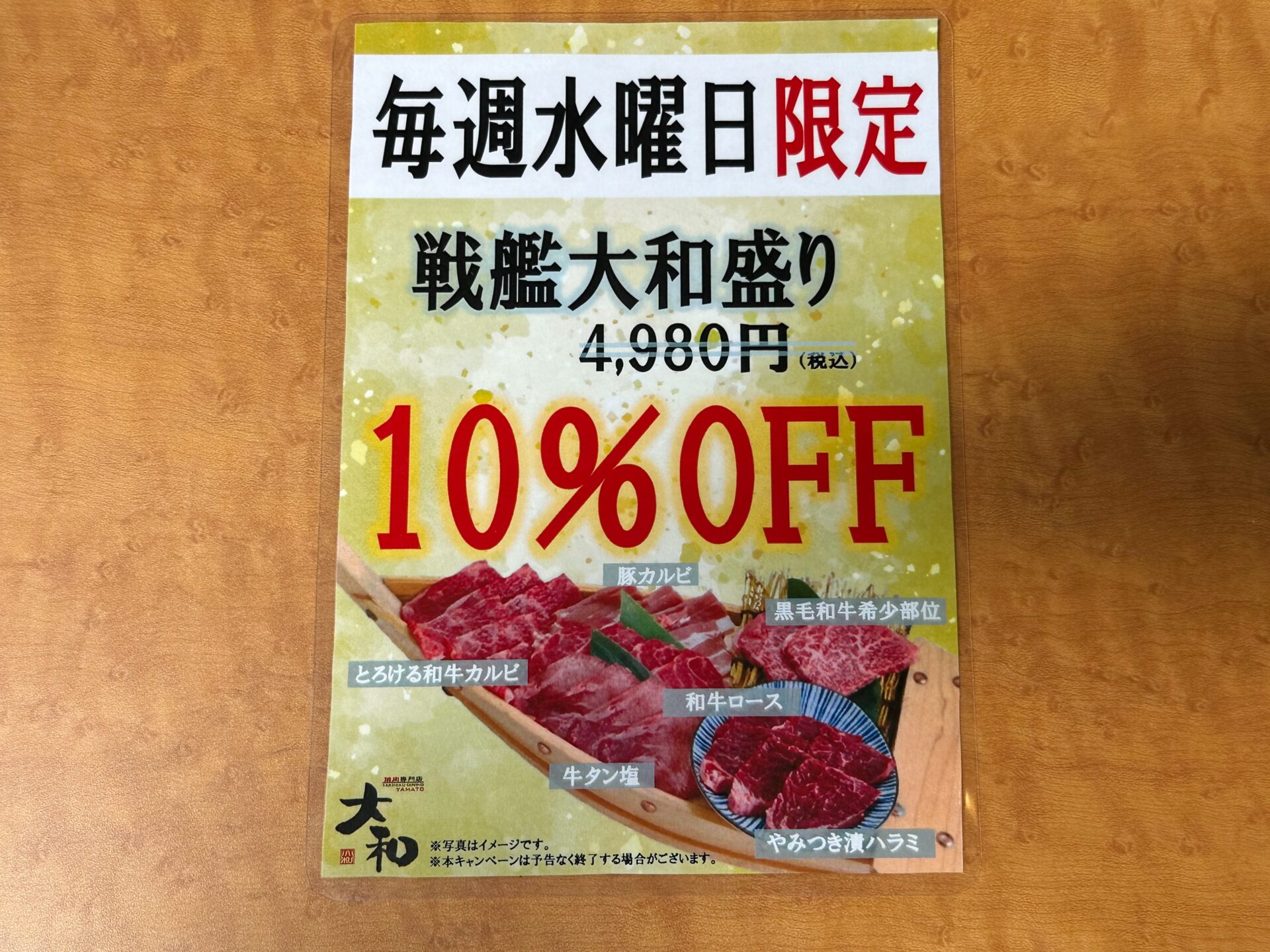 千葉で人気の焼肉店「焼肉DINING大和」では、毎週水曜日にお得なキャンペーンを実施中。名物の「戦艦大和盛り」が通常4,980円(税込)のところ、10%OFFで楽しめます。